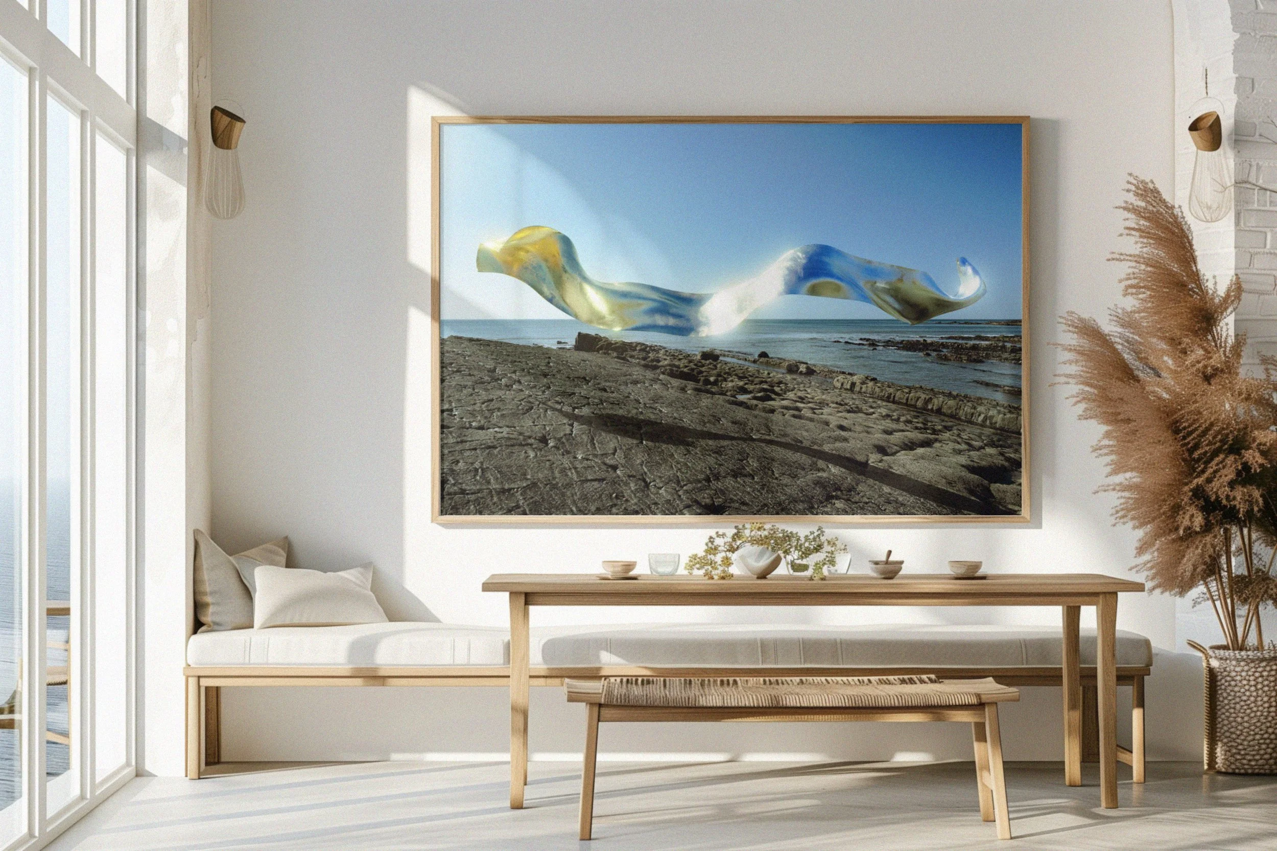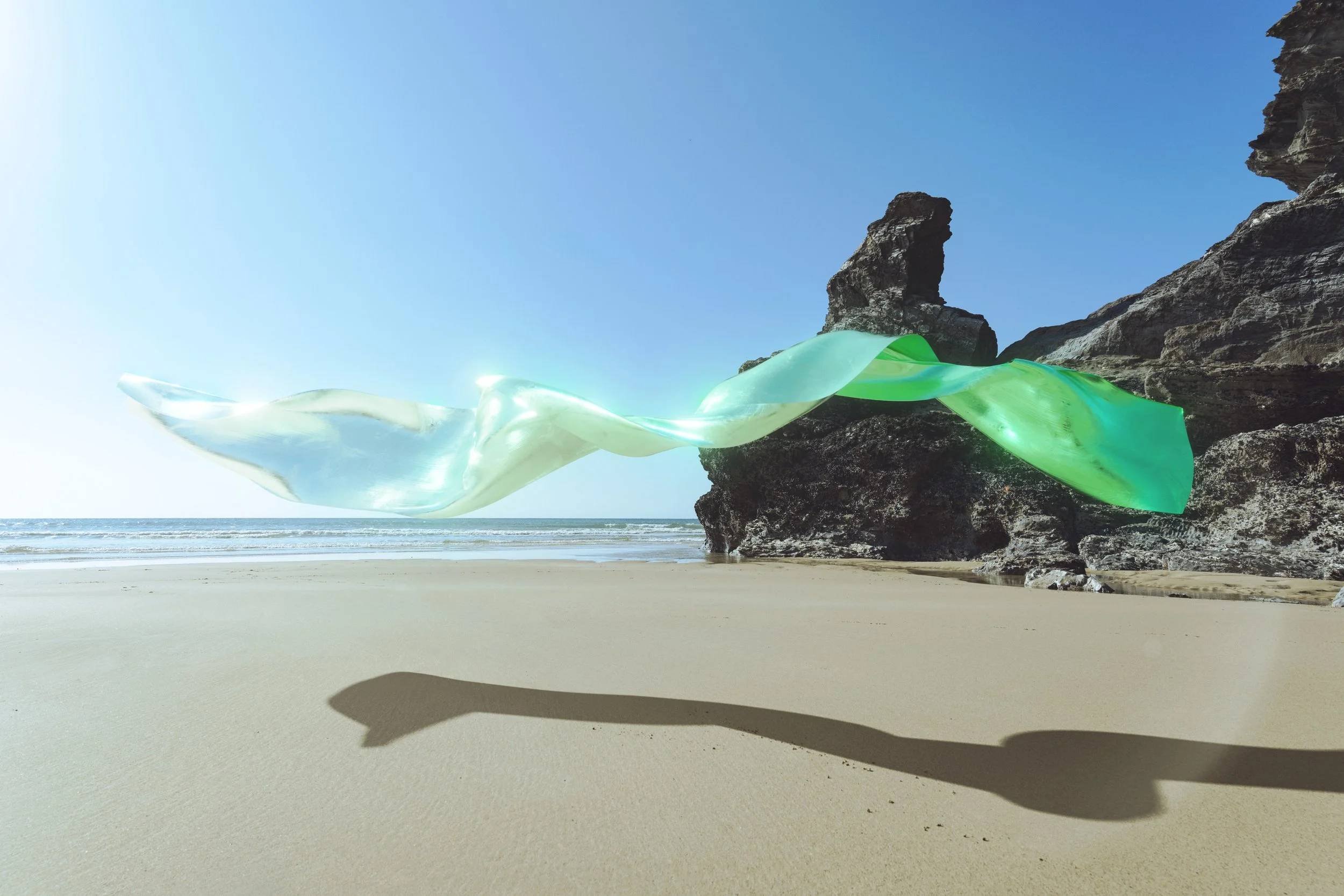 This series began in Cornwall, UK. Simulated metallic cloth ribbons act as a metaphor for the weathered coastline.